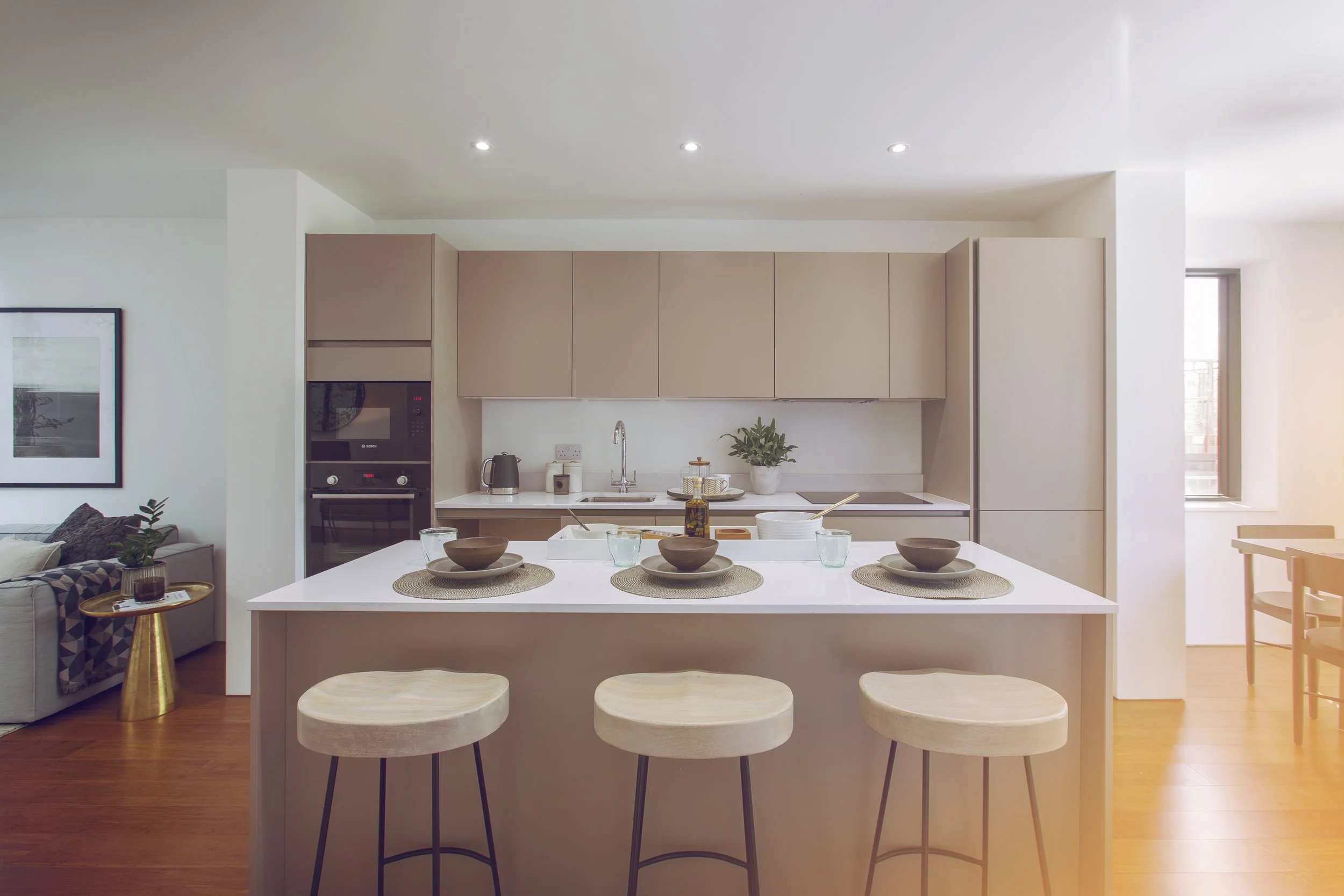 Modern furniture is blended with wood and linen finishes to create warmth and tactility. Clean-lined sofas, built-in joinery, and simple dining furniture sit alongside oak floors, timber details, and linen curtains. The result is a home that feels modern but gentle—functional, uncluttered, and well suited to a young family and a slower, more intentional way of living.